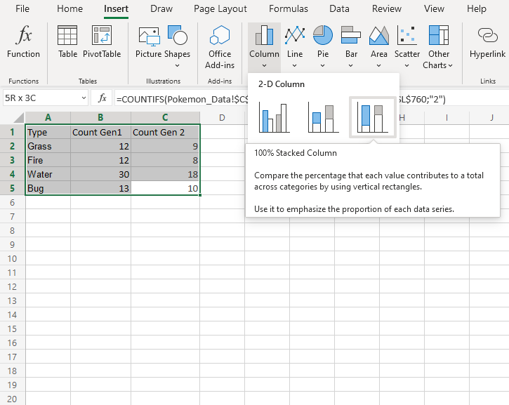 1. Click on the insert menu, then click on the column menu () and choose Clustered Column () from the drop-down menu