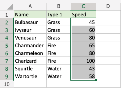 1. Select the range of Speed values C2:C9