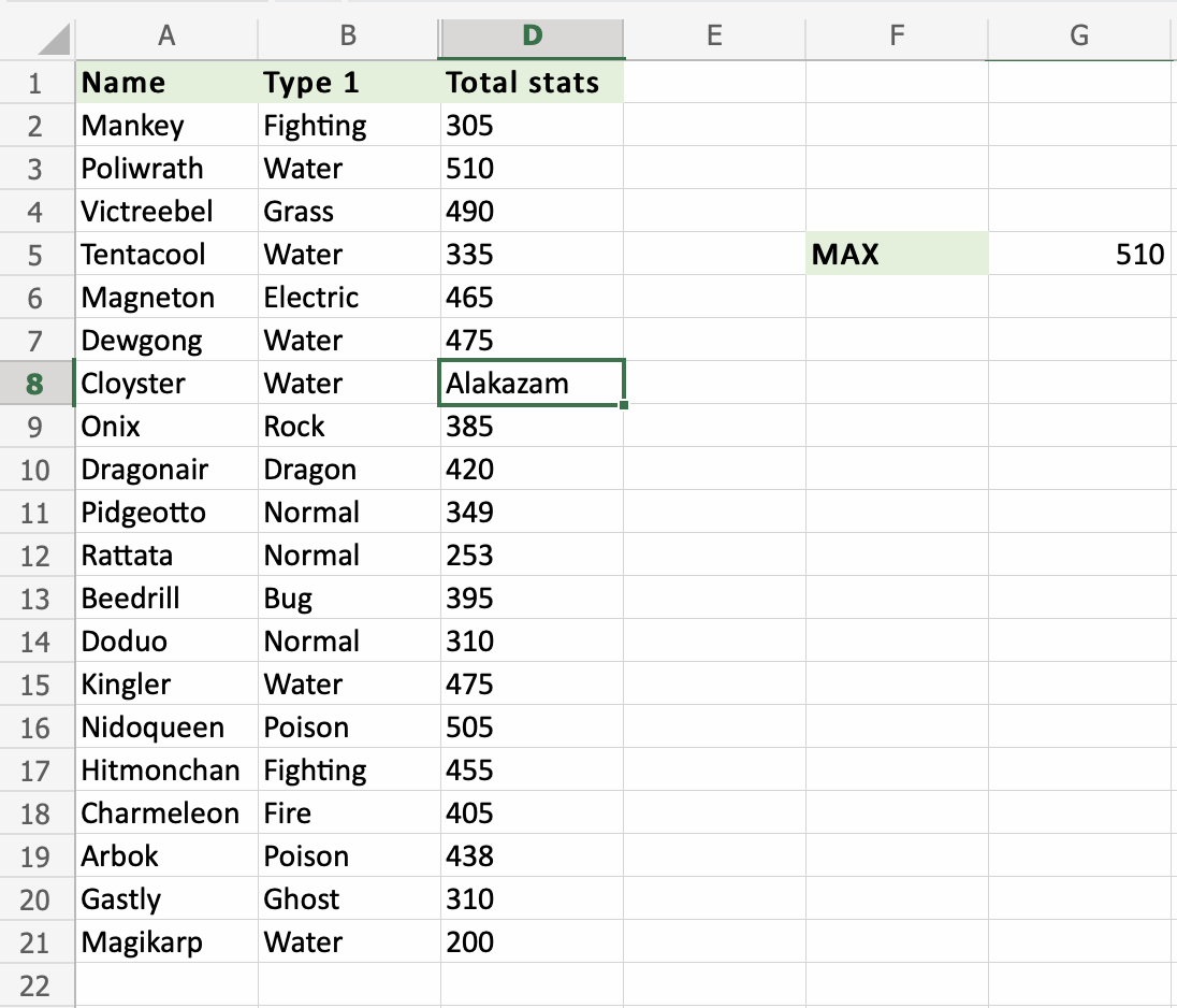 Nice going. The function ignores the text typed in the range. 510 is returned as the new highest value, since the old one was replaced with text. Poliwrath is now the Pokemon with the highest Total stats in the range D2:D21.