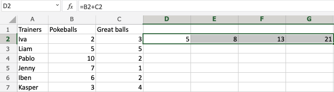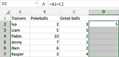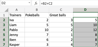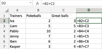 Let's have a look at a relative reference example, helping the Pokemon trainers to count their Pokeballs (B2:B7) and Great balls (C2:C7).