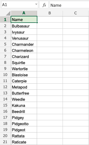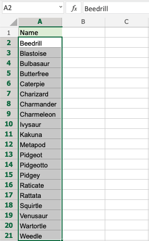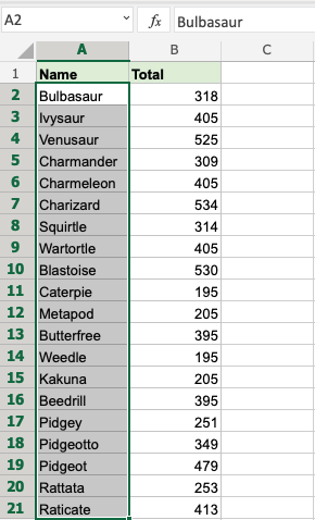 Sort the Pokemons in the range A2:A21 by their Name, ascending from smallest to largest (A-Z).