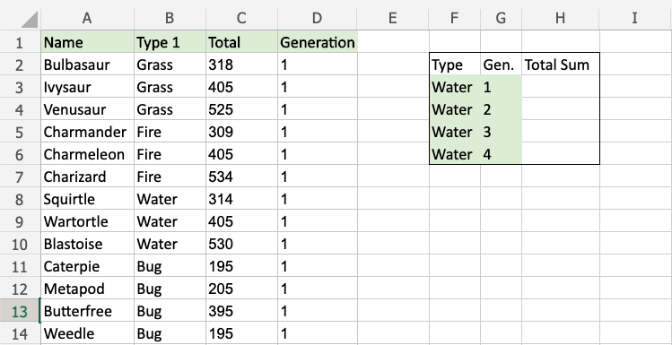 The conditions are that the type is "Water" and Generation is 1.