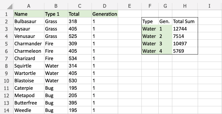 The function now calculates the sum of total stats for the 1st Generation Water type Pokemon.