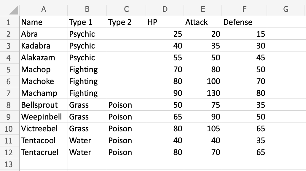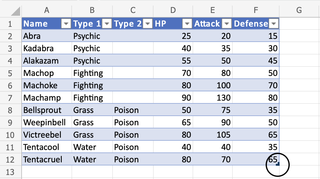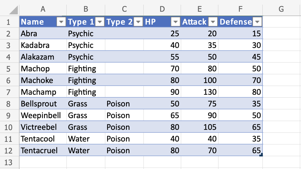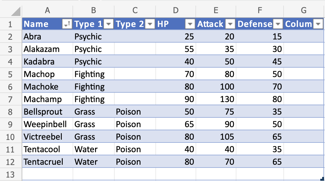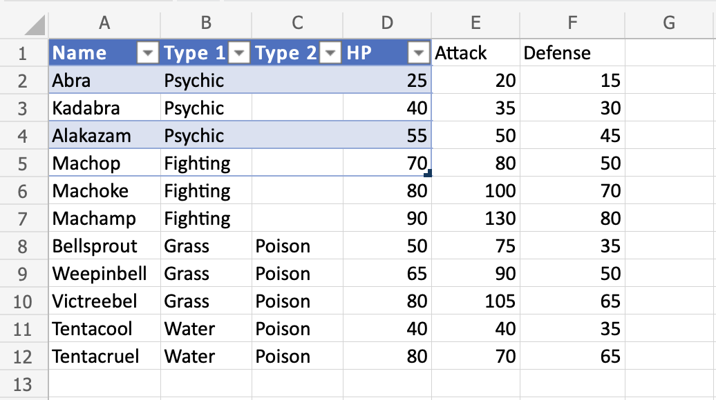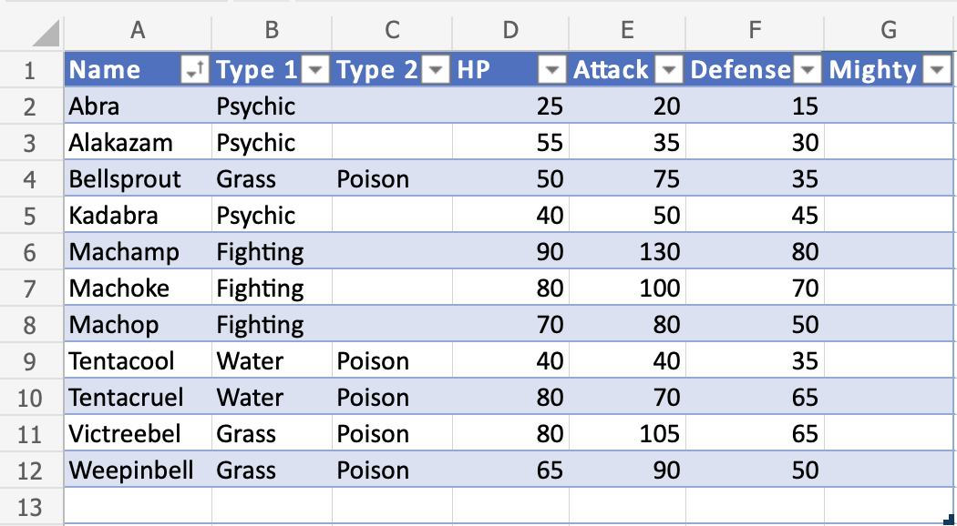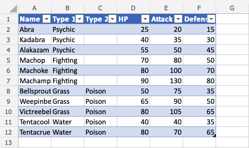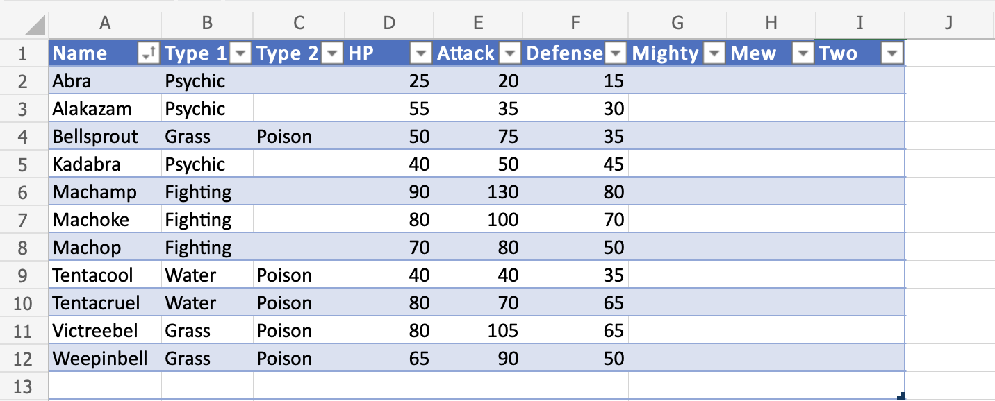Nice! The table has successfully sorted the Pokemon in the range A1:A12 by their names.