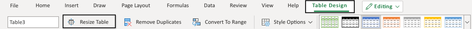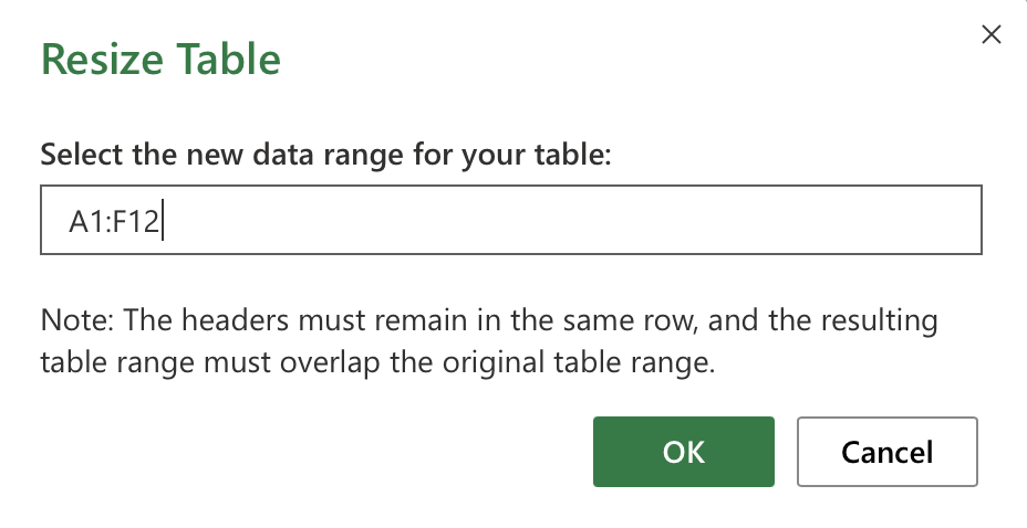 Clicking the Resize Table command allows you to set a new range for the table.