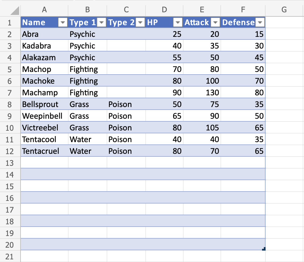 Great! The table has been resized to from A1:F12 to A1:F20.