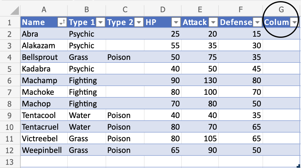 The filter option only includes the Pokemon in the tables range (A1:A5). The connection to the cells outside of the table is broken.