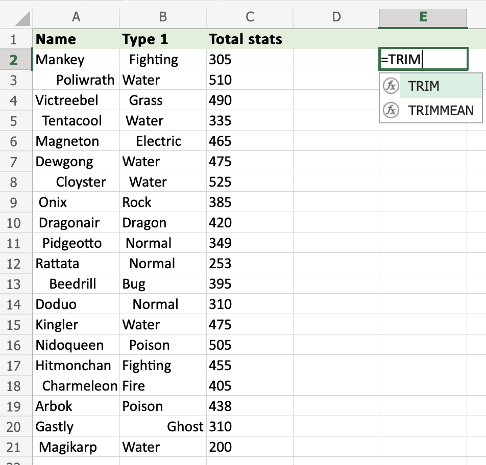 Use Trim to tidy up irregular spaces in the dataset within the range A2:C21.
