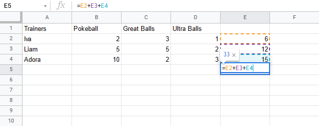 Let's help Iva to count her Pokeballs. You find Iva in A2(Iva). The values in row 2 B2(2), C2(3), D2(1) belong to her.